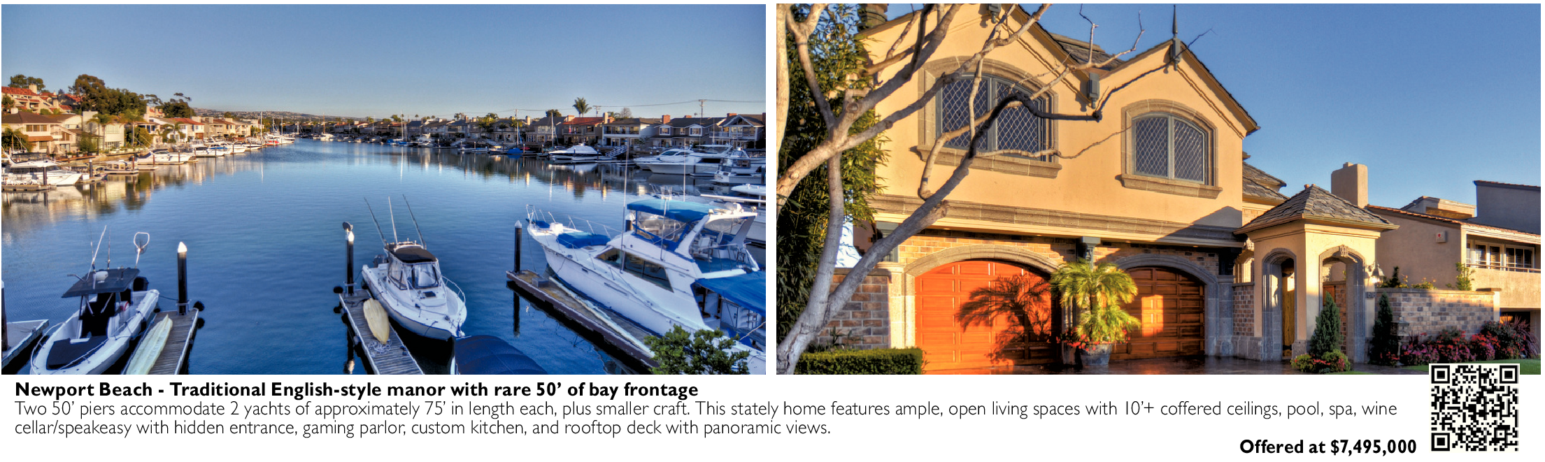 Newport Beach - Traditional English-style manor with rare 50’ of bay frontage Two 50’ piers accommodate 2 yachts of approximately 75’ in length each, plus smaller craft. This stately home features ample, open living spaces with 10’+ coffered ceilings, pool, spa, wine cellar/speakeasy with hidden entrance, gaming parlor, custom kitchen, and rooftop deck with panoramic views.