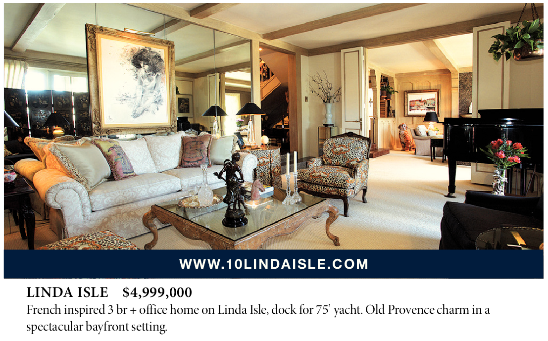 LINDA ISLE $4,999,000 French inspired 3 br + office home on Linda Isle, dock for 75’ yacht. Old Provence charm in a spectacular bayfront setting.