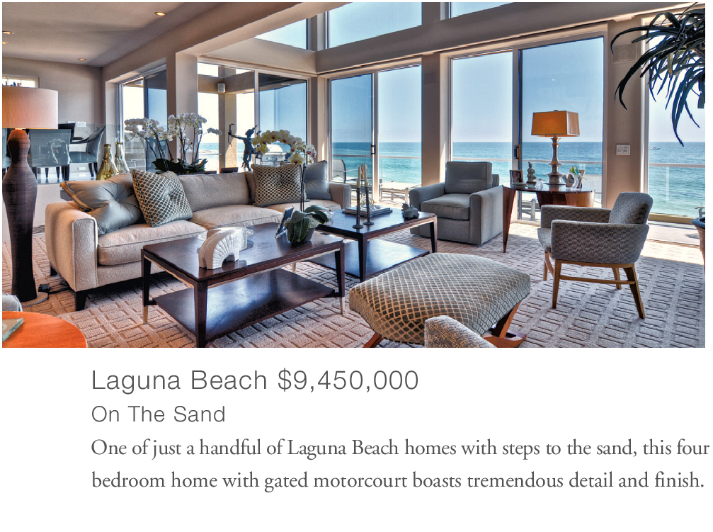 Laguna Beach $9,450,000 On The Sand One of just a handful of Laguna Beach homes with steps to the sand, this four bedroom home with gated motorcourt boasts tremendous detail and finish.