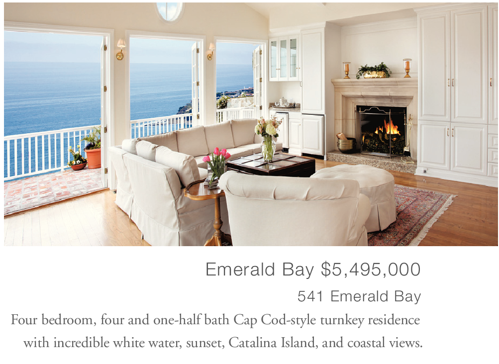 541 Emerald Bay Four bedroom, four and one-half bath Cap Cod-style turnkey residence with incredible white water, sunset, Catalina Island, and coastal views.