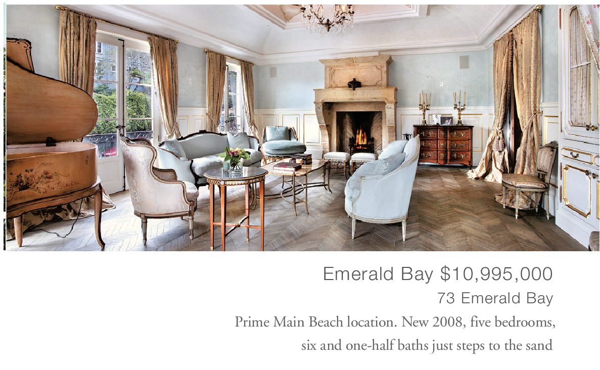 Emerald Bay $10,995,000 73 Emerald Bay Prime Main Beach location. New 2008, five bedrooms, six and one-half baths just steps to the sand