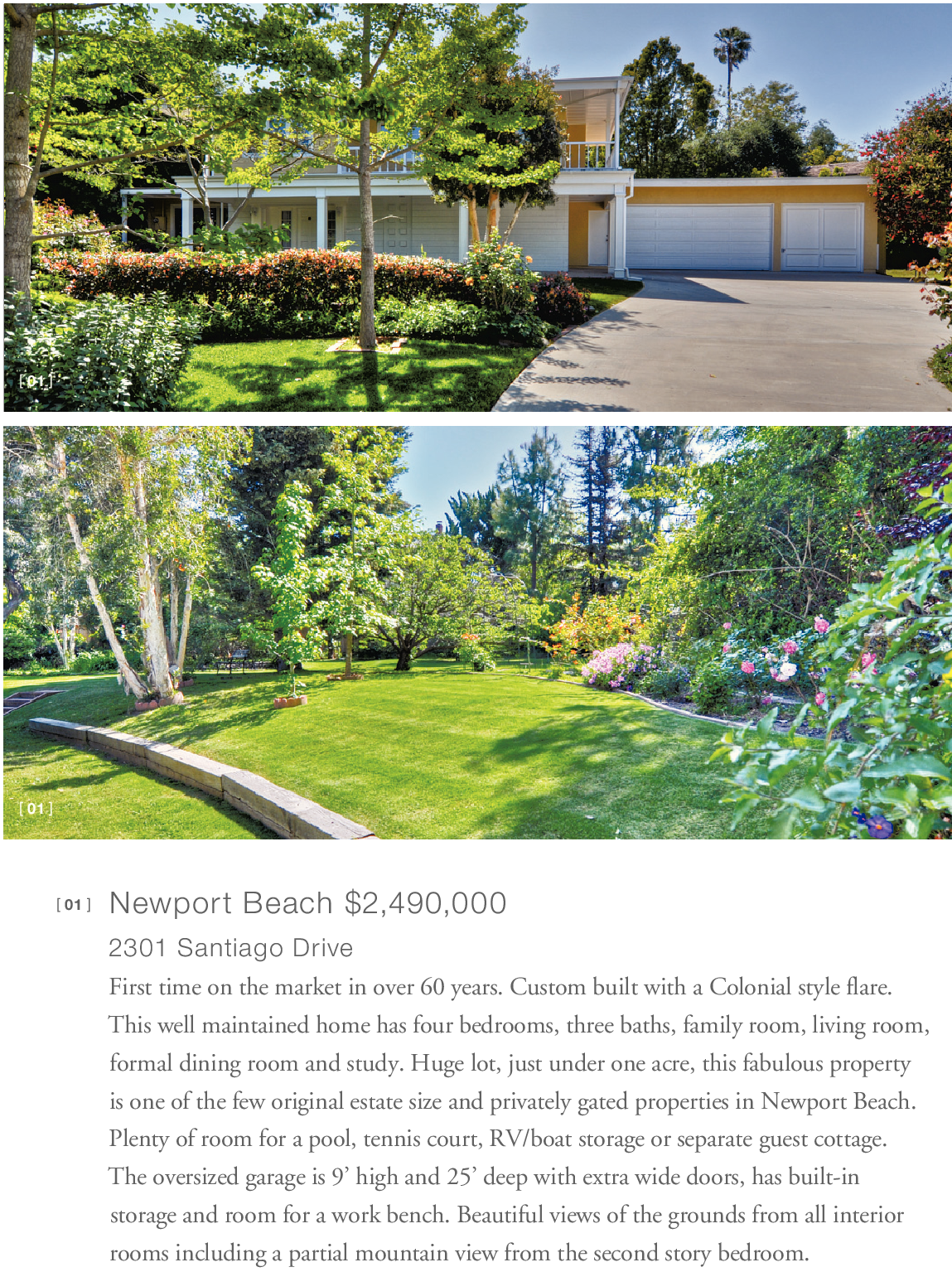 2301 Santiago Drive First time on the market in over 60 years. Custom built with a Colonial style flare. This well maintained home has four bedrooms, three baths, family room, living room, formal dining room and study. Huge lot, just under one acre, this fabulous property is one of the few original estate size and privately gated properties in Newport Beach. Plenty of room for a pool, tennis court, RV/boat storage or separate guest cottage. The oversized garage is 9’ high and 25’ deep with extra wide doors, has built-in storage and room for a work bench. Beautiful views of the grounds from all interior rooms including a partial mountain view from the second story bedroom.