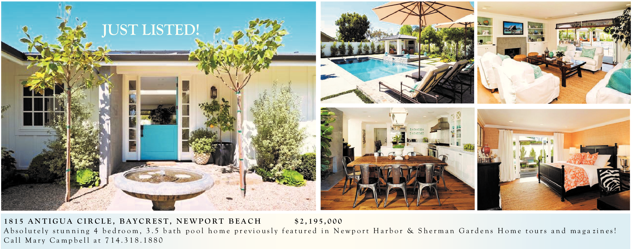 1815 ANTIGUA CIRCLE, BAYCREST, NEWPORT BEACH $2,195,000 Absolutely stunning 4 bedroom, 3.5 bath pool home previously featured in Newport Harbor & Sherman Gardens Home tours and maga zines! Call Mary Campbell at 714.318.1880