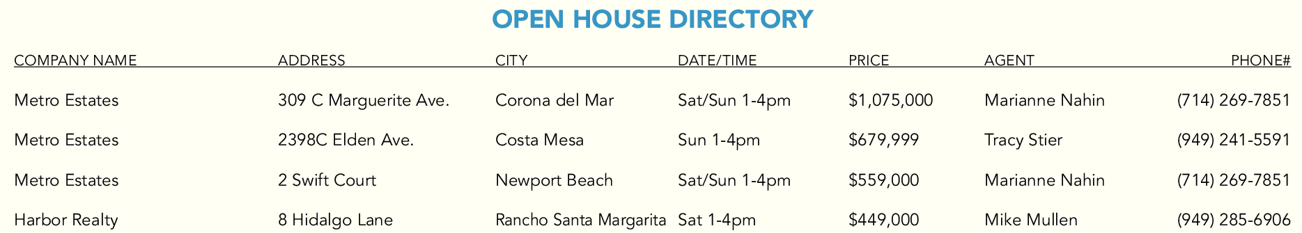 Metro Estates 309 C Marguerite Ave. Corona del Mar Sat/Sun 1-4pm $1,075,000 Marianne Nahin (714) 269-7851