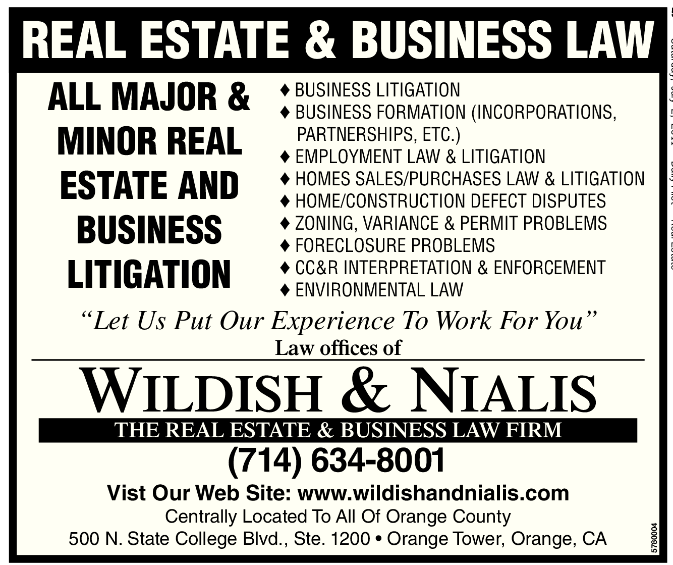REAL ESTATE & BUSINESS LAW ALL MAJOR & MINOR REAL ESTATE AND BUSINESS LITIGATION BUSINESS LITIGATION BUSINESS FORMATION (INCORPORATIONS, PARTNERSHIPS, ETC.) EMPLOYMENT LAW & LITIGATION HOMES SALES/PURCHASES LAW & LITIGATION HOME/CONSTRUCTION DEFECT DISPUTES ZONING, VARIANCE & PERMIT PROBLEMS FORECLOSURE PROBLEMS CC&R INTERPRETATION & ENFORCEMENT ENVIRONMENTAL LAW “Let Us Put Our Experience To Work For You” Law offices of WILDISH & NIALIS THE REAL ESTATE & BUSINESS LAW FIRM (714) 634-8001 Vist Our Web Site: www.wildishandnialis.com Centrally Located To All Of Orange County 500 N. State College Blvd., Ste. 1200 • Orange Tower, Orange, CA 55
