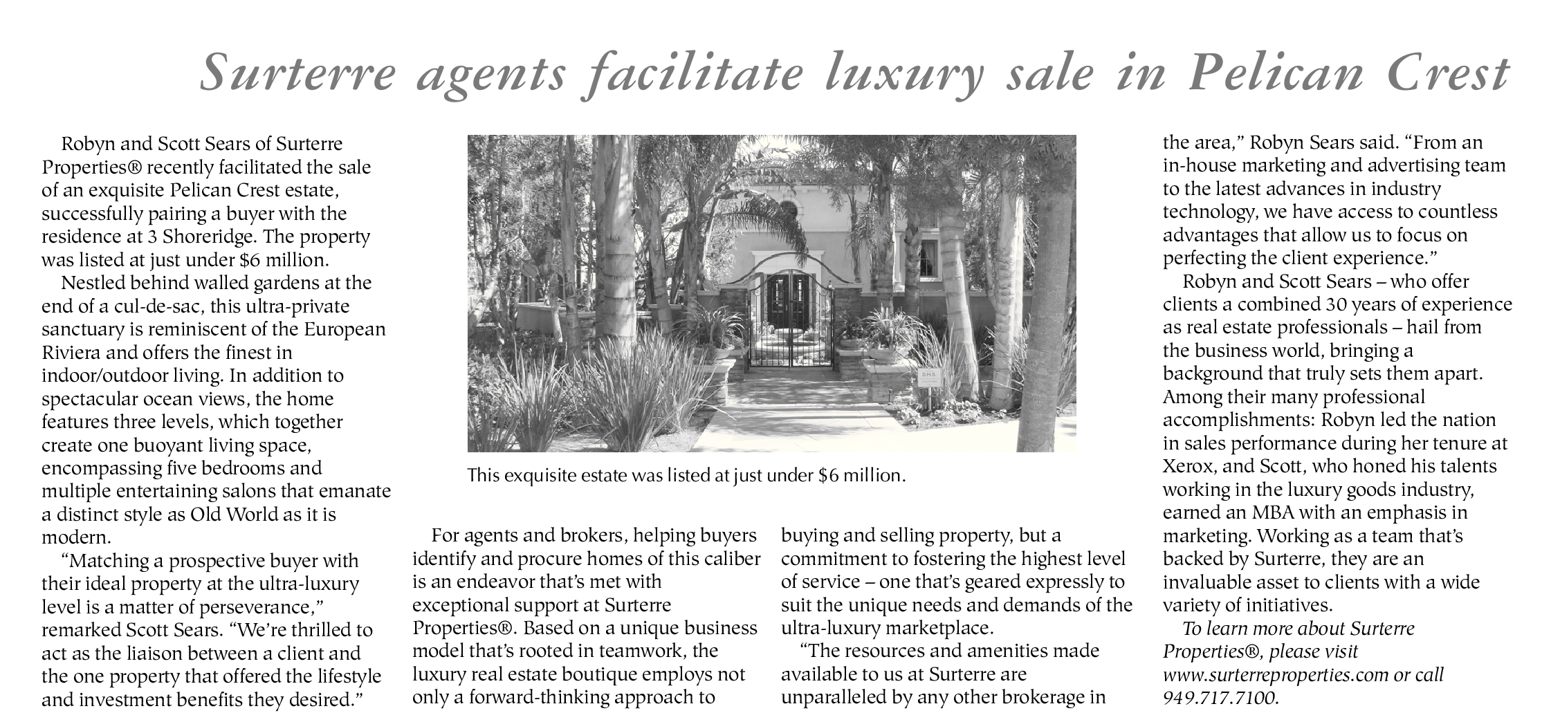 Robyn and Scott Sears of Surterre Properties® recently facilitated the sale of an exquisite Pelican Crest estate, successfully pairing a buyer with the residence at 3 Shoreridge. The property was listed at just under $6 million.