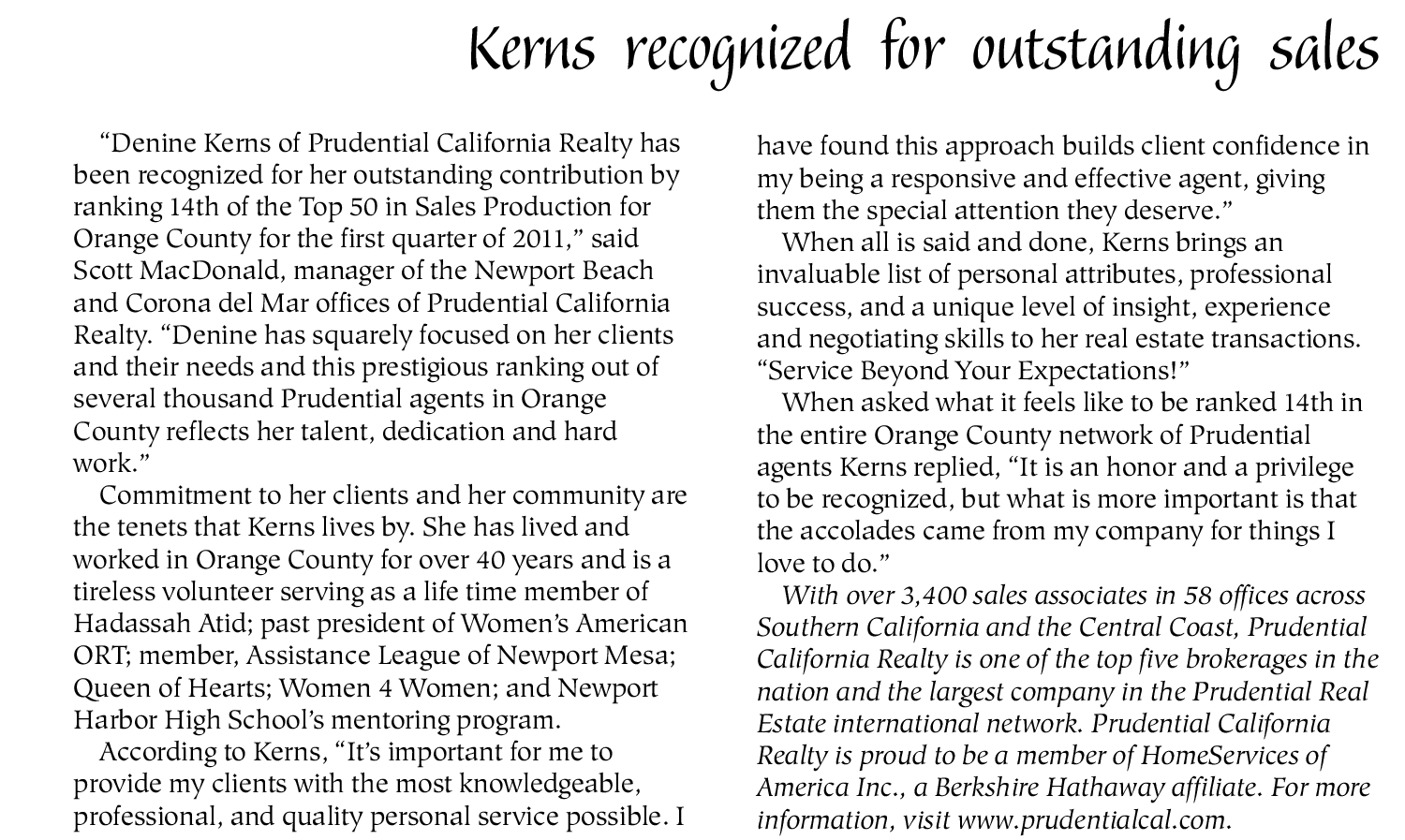 Kerns recognized for outstanding sales“Denine Kerns of Prudential California Realty has been recognized for her outstanding contribution by ranking 14th of the Top 50 in Sales Production for Orange County for the first quarter of 2011,” said Scott MacDonald, manager of the Newport Beach and Corona del Mar offices of Prudential California Realty. “Denine has squarely focused on her clients and their needs and this prestigious ranking out of several thousand Prudential agents in Orange County reflects her talent, dedication and hard work.” Commitment to her clients and her community are the tenets that Kerns lives by. She has lived and worked in Orange County for over 40 years and is a tireless volunteer serving as a life time member of Hadassah Atid; past president of Women’s American ORT; member, Assistance League of Newport Mesa; Queen of Hearts; Women 4 Women; and Newport Harbor High School’s mentoring program. According to Kerns, “It’s important for me to provide my clients with the most knowledgeable, professional, and quality personal service possible. I have found this approach builds client confidence in my being a responsive and effective agent, giving them the special attention they deserve.” When all is said and done, Kerns brings an invaluable list of personal attributes, professional success, and a unique level of insight, experience and negotiating skills to her real estate transactions. “Service Beyond Your Expectations!” When asked what it feels like to be ranked 14th in the entire Orange County network of Prudential agents Kerns replied, “It is an honor and a privilege to be recognized, but what is more important is that the accolades came from my company for things I love to do.” With over 3,400 sales associates in 58 offices across Southern California and the Central Coast, Prudential California Realty is one of the top five brokerages in the nation and the largest company in the Prudential Real Estate international network. Prudential California Realty is proud to be a member of HomeServices of America Inc., a Berkshire Hathaway affiliate. For more information, visit www.prudentialcal.com.