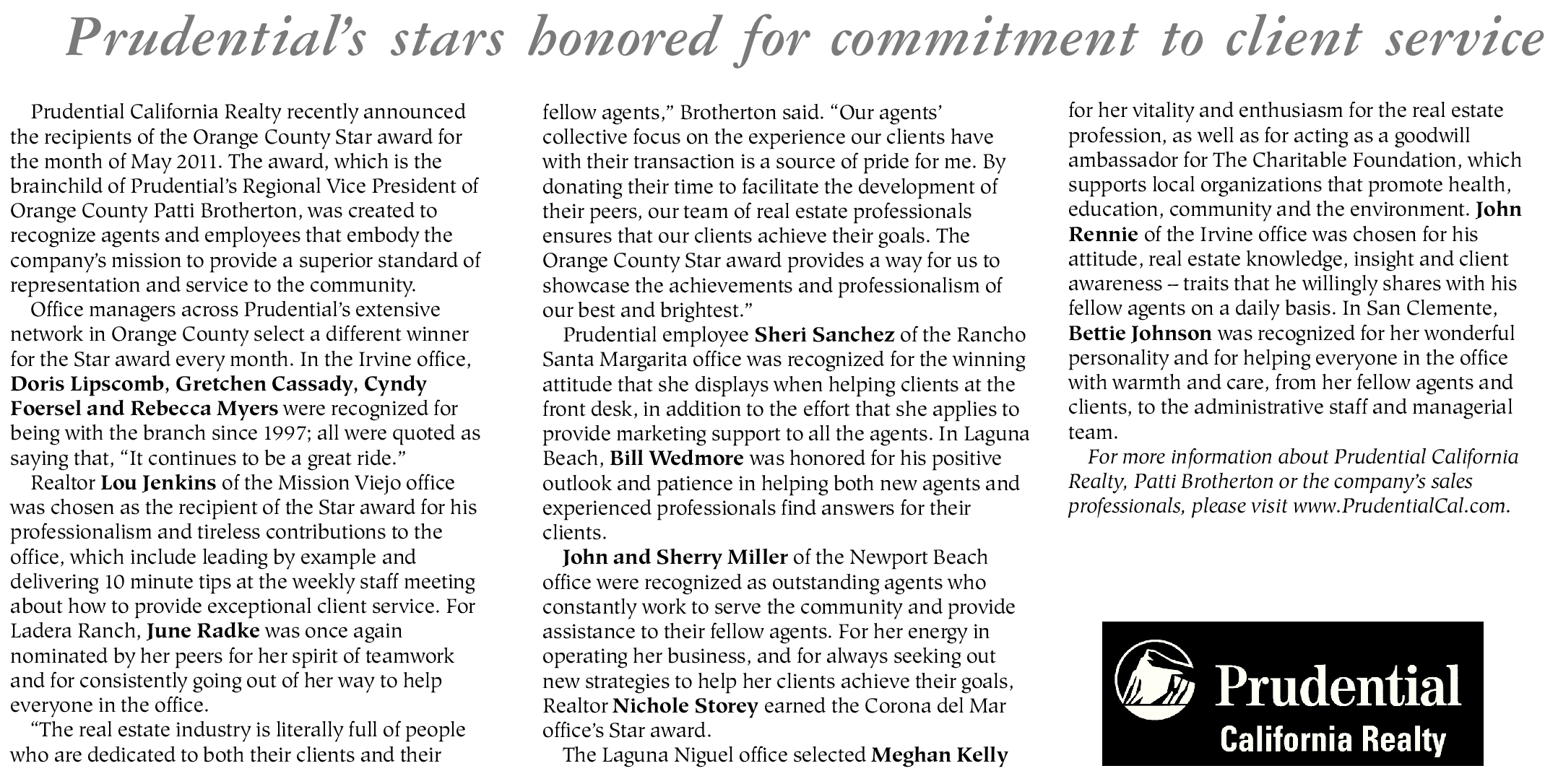 Prudential California Realty recently announced the recipients of the Orange County Star award for the month of May 2011. The award, which is the brainchild of Prudential’s Regional Vice President of Orange County Patti Brotherton, was created to recognize agents and employees that embody the company’s mission to provide a superior standard of representation and service to the community.