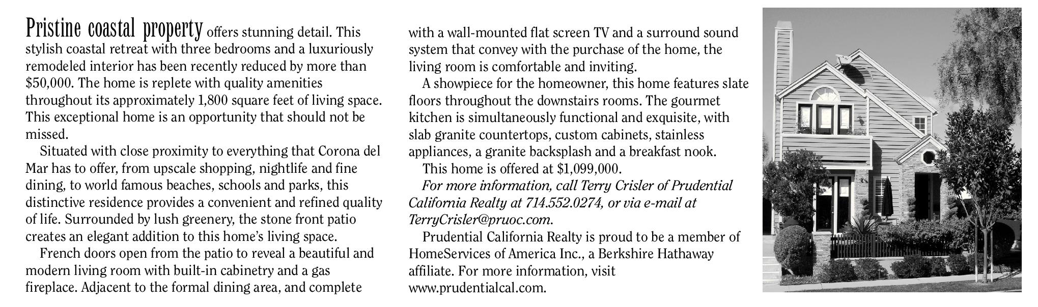 This home is offered at $1,099,000. For more information, call Terry Crisler of Prudential California Realty at 714.552.0274, or via e-mail at TerryCrisler@pruoc.com.
