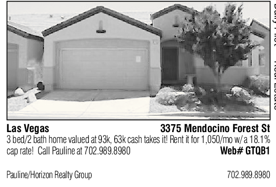 Las Vegas 3375 Mendocino Forest St 3 bed/2 bath home valued at 93k, 63k cash takes it! Rent it for 1,050/mo w/ a 18.1% cap rate! Call Pauline at 702.989.8980 Web# GTQB1 Pauline/Horizon Realty Group 702.989.8980