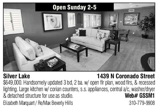 Open Sunday 2-5 Silver Lake 1439 N Coronado Street $649,000. Handsomely updated 3 bd, 2 ba. w/ open flr plan, wood flrs, & recessed lighting. Large kitchen w/ corian counters, s.s. appliances, central a/c, washer/dryer & detached structure for use as studio. Web# GSSM1 Elizabeth Marquart / Re/Max Beverly Hills 310-779-9908 See also