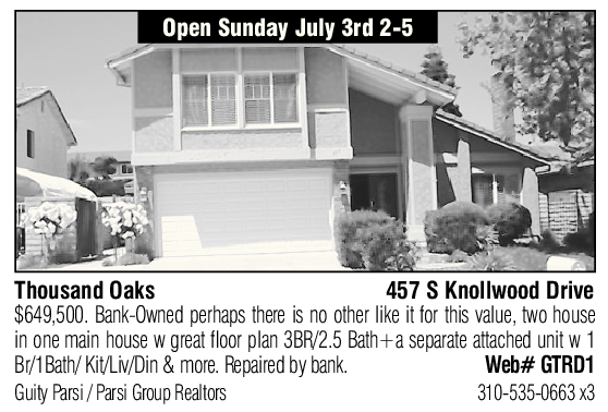 Open Sunday July 3rd 2-5 Thousand Oaks 457 S Knollwood Drive $649,500. Bank-Owned perhaps there is no other like it for this value, two house in one main house w great floor plan 3BR/2.5 Bath+a separate attached unit w 1 Br/1Bath/ Kit/Liv/Din & more. Repaired by bank. Web# GTRD1 Guity Parsi / Parsi Group Realtors 310-535-0663 x3
