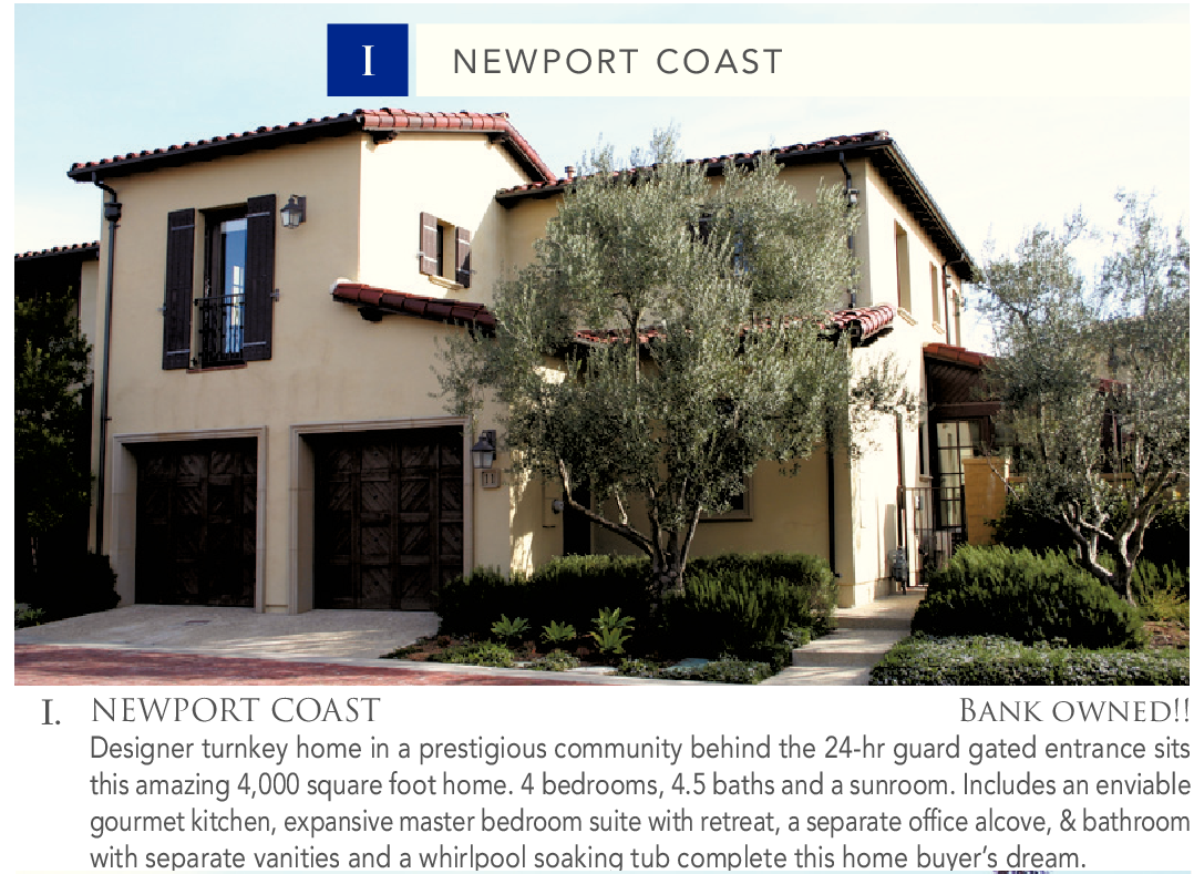 I. I NEWPORT COAST NEWPORT COAST Bank owned!! Designer turnkey home in a prestigious community behind the 24-hr guard gated entrance sits this amazing 4,000 square foot home. 4 bedrooms, 4.5 baths and a sunroom. Includes an enviable gourmet kitchen, expansive master bedroom suite with retreat, a separate office alcove, & bathroom with separate vanities and a whirlpool soaking tub complete this home buyer’s dream.
