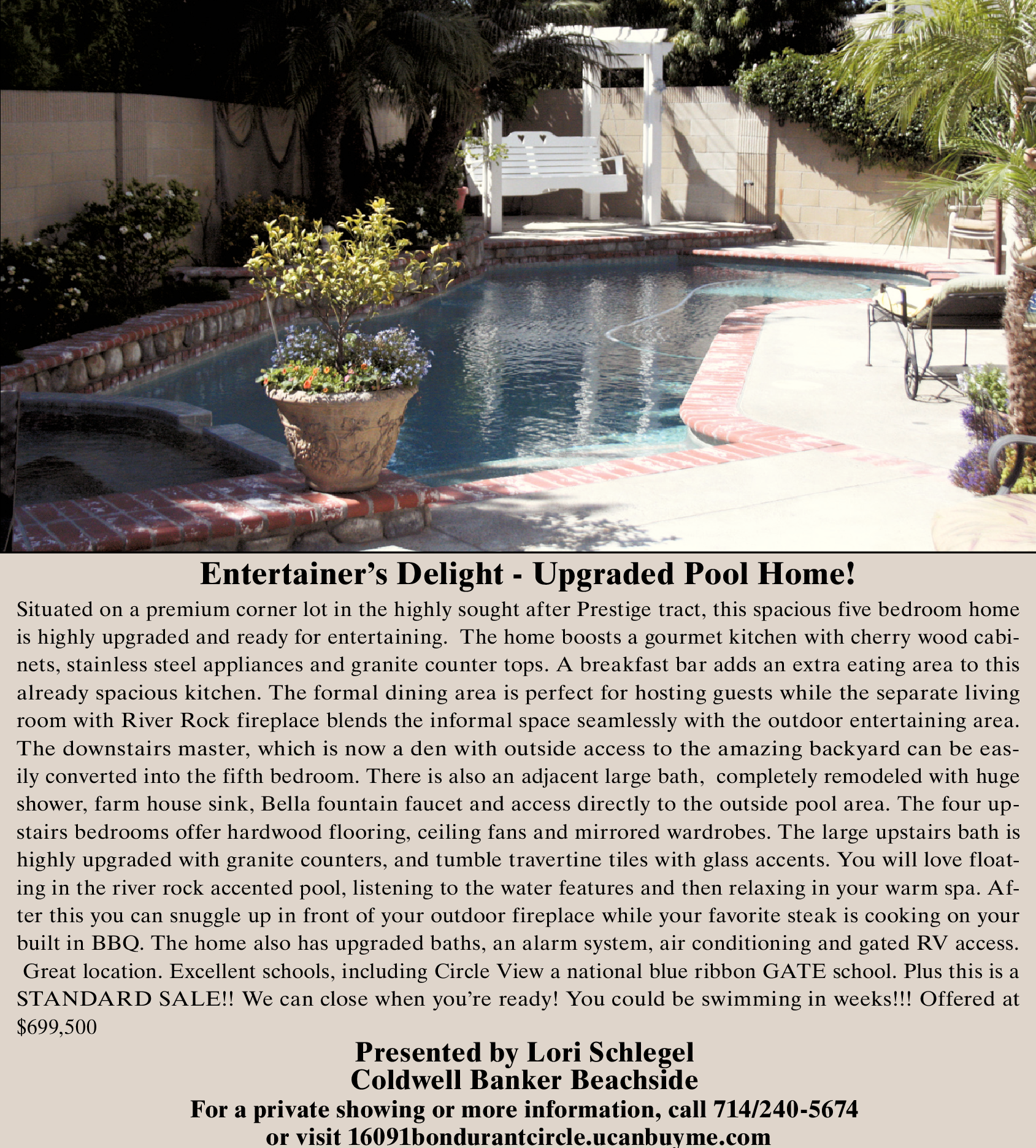 Entertainer’s Delight - Upgraded Pool Home! Situated on a premium corner lot in the highly sought after Prestige tract, this spacious five bedroom home is highly upgraded and ready for entertaining. The home boosts a gourmet kitchen with cherry wood cabinets, stainless steel appliances and granite counter tops. A breakfast bar adds an extra eating area to this already spacious kitchen. The formal dining area is perfect for hosting guests while the separate living room with River Rock fireplace blends the informal space seamlessly with the outdoor entertaining area. The downstairs master, which is now a den with outside access to the amazing backyard can be easily converted into the fifth bedroom. There is also an adjacent large bath, completely remodeled with huge shower, farm house sink, Bella fountain faucet and access directly to the outside pool area. The four upstairs bedrooms offer hardwood flooring, ceiling fans and mirrored wardrobes. The large upstairs bath is highly upgraded with granite counters, and tumble travertine tiles with glass accents. You will love floating in the river rock accented pool, listening to the water features and then relaxing in your warm spa. After this you can snuggle up in front of your outdoor fireplace while your favorite steak is cooking on your built in BBQ. The home also has upgraded baths, an alarm system, air conditioning and gated RV access. Great location. Excellent schools, including Circle View a national blue ribbon GATE school. Plus this is a STANDARD SALE!! We can close when you’re ready! You could be swimming in weeks!!! Offered at $699,500 Presented by Lori Schlegel Coldwell Banker Beachside For a private showing or more information, call 714/240-5674 or visit 16091bondurantcircle.ucanbuyme.com
