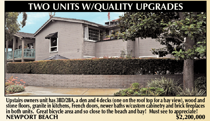 Upstairs owners unit has 3BD/2BA, a den and 4 decks (one on the roof top for a bay view), wood and stone floors, granite in kitchens, French doors, newer baths w/custom cabinetry and brick fireplaces in both units. Great bicycle area and so close to the beach and bay! Must see to appreciate! NEWPORT BEACH $2,200,000