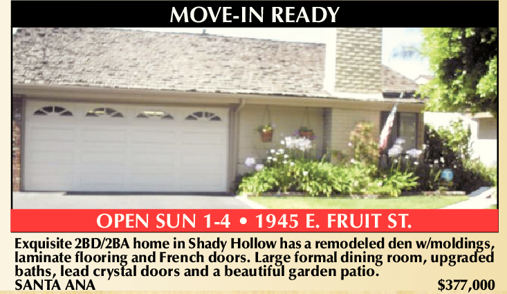 Exquisite 2BD/2BA home in Shady Hollow has a remodeled den w/moldings, laminate flooring and French doors. Large formal dining room, upgraded baths, lead crystal doors and a beautiful garden patio. SANTA ANA $377,000