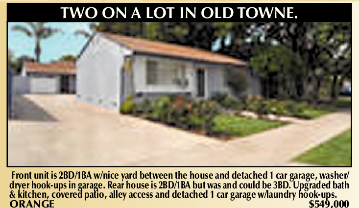 Front unit is 2BD/1BA w/nice yard between the house and detached 1 car garage, washer/ dryer hook-ups in garage. Rear house is 2BD/1BA but was and could be 3BD. Upgraded bath & kitchen, covered patio, alley access and detached 1 car garage w/laundry hook-ups. ORANGE $549,000