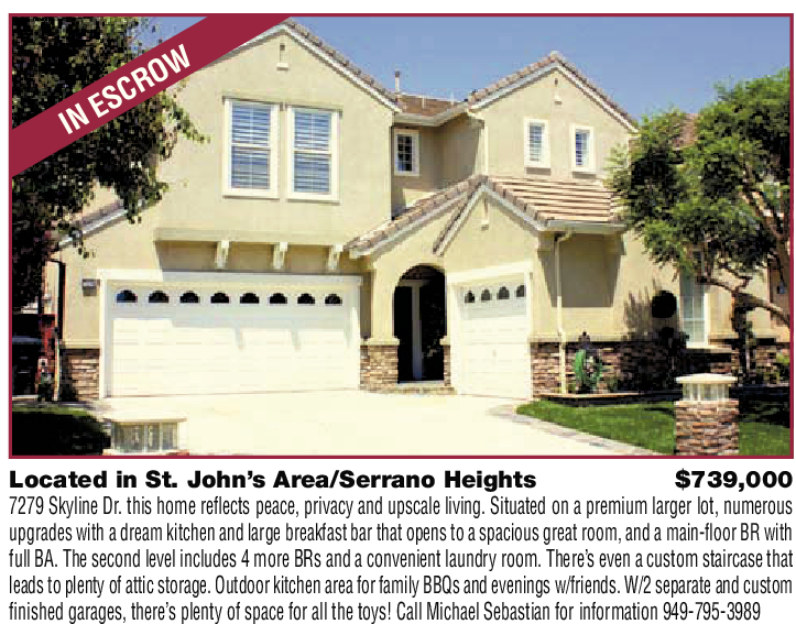 Located in St. John’s Area/Serrano Heights $739,000 7279 Skyline Dr. this home reflects peace, privacy and upscale living. Situated on a premium larger lot, numerous upgrades with a dream kitchen and large breakfast bar that opens to a spacious great room, and a main-floor BR with full BA. The second level includes 4 more BRs and a convenient laundry room. There’s even a custom staircase that leads to plenty of attic storage. Outdoor kitchen area for family BBQs and evenings w/friends. W/2 separate and custom finished garages, there’s plenty of space for all the toys! Call Michael Sebastian for information 949-795-3989
