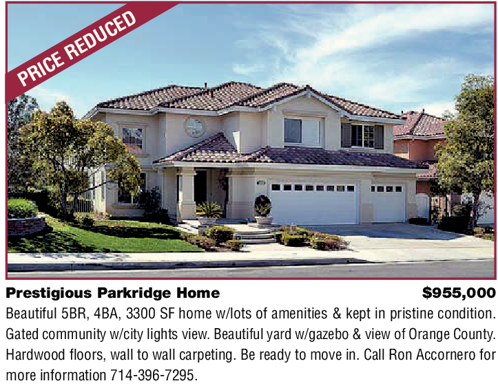 Prestigious Parkridge Home $955,000 Beautiful 5BR, 4BA, 3300 SF home w/lots of amenities & kept in pristine condition. Gated community w/city lights view. Beautiful yard w/gazebo & view of Orange County. Hardwood floors, wall to wall carpeting. Be ready to move in. Call Ron Accornero for more information 714-396-7295.