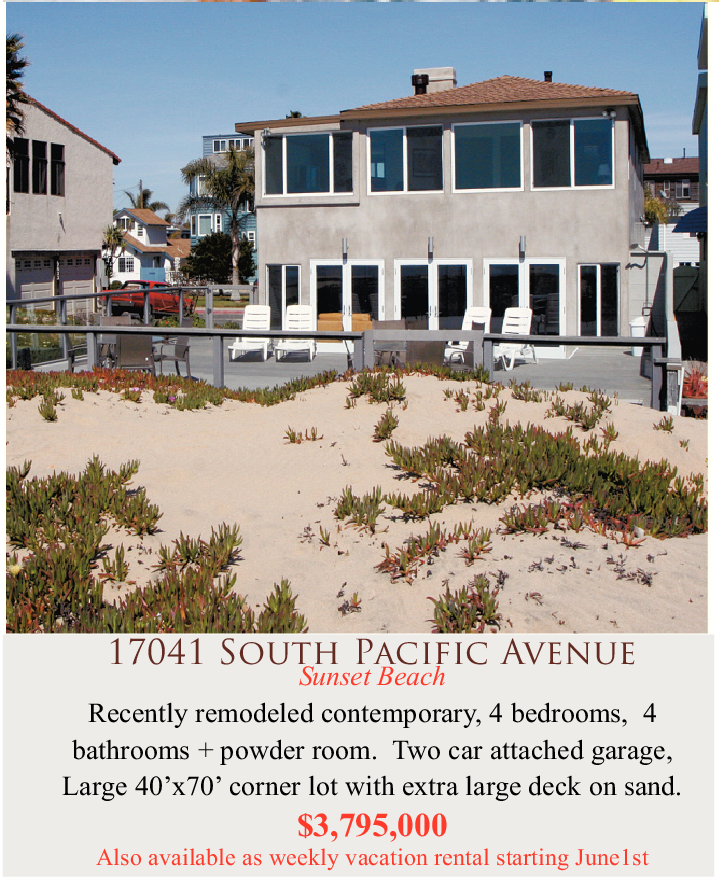 Sunset Beach Recently remodeled contemporary, 4 bedrooms, 4 bathrooms + powder room. Two car attached garage, Large 40’x70’ corner lot with extra large deck on sand.