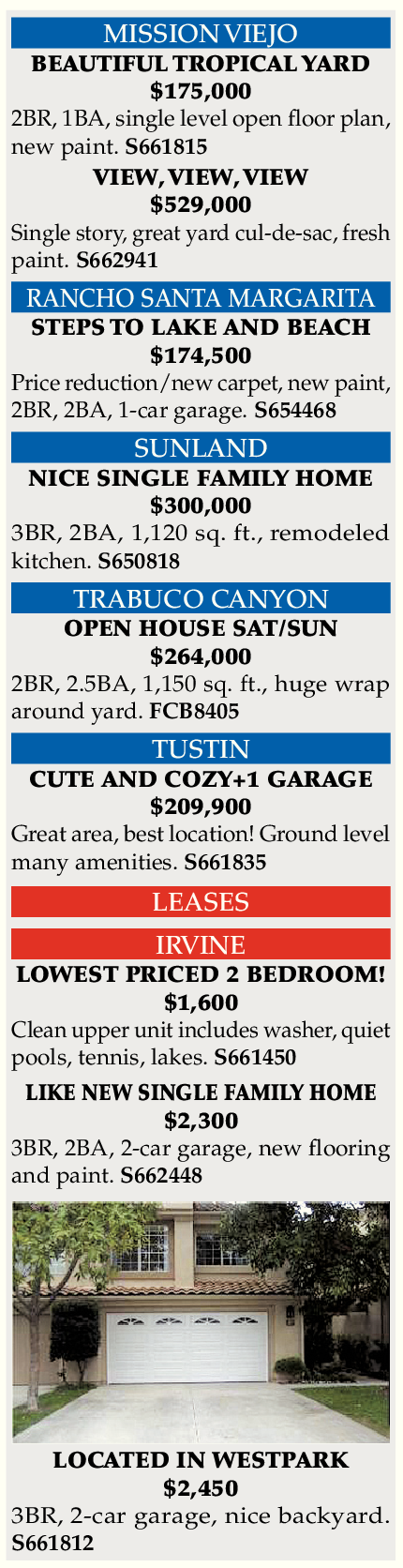 MISSION VIEJO BEAUTIFUL TROPICAL YARD $175,000 2BR, 1BA, single level open floor plan, new paint. S661815 VIEW, VIEW, VIEW $529,000 Single story, great yard cul-de-sac, fresh paint. S662941