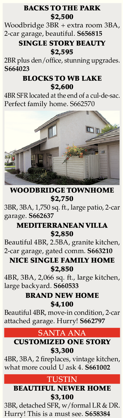 BACKS TO THE PARK $2,500 Woodbridge 3BR + extra room 3BA, 2-car garage, beautiful. S656815 SINGLE STORY BEAUTY $2,595 2BR plus den/office, stunning upgrades. S664023 BLOCKS TO WB LAKE $2,600 4BR SFR located at the end of a cul-de-sac. Perfect family home. S662570