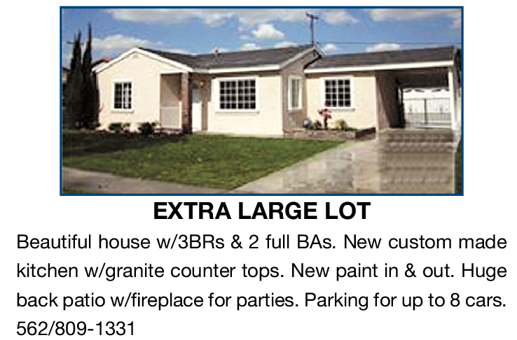 EXTRA LARGE LOT Beautiful house w/3BRs & 2 full BAs. New custom made kitchen w/granite counter tops. New paint in & out. Huge back patio w/fireplace for parties. Parking for up to 8 cars. 562/809-1331