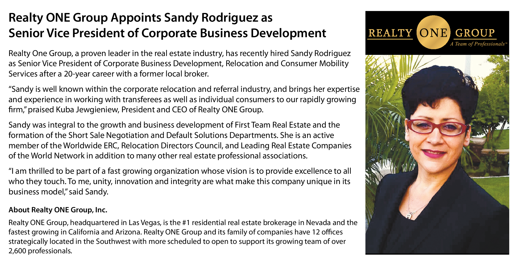 Realty One Group, a proven leader in the real estate industry, has recently hired Sandy Rodriguez as Senior Vice President of Corporate Business Development, Relocation and Consumer Mobility Services after a 20-year career with a former local broker.