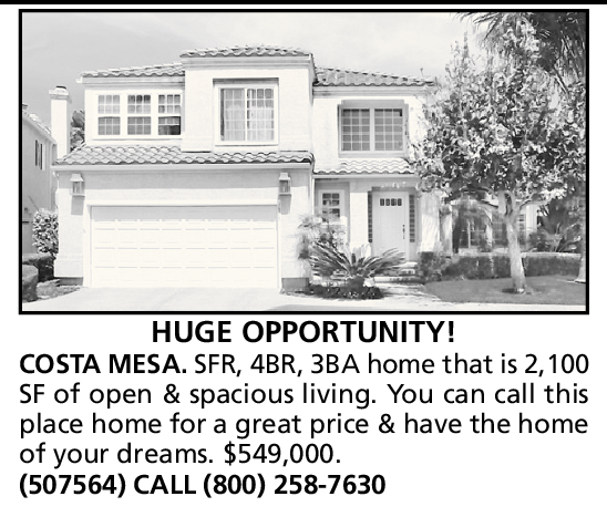 COSTA MESA. SFR, 4BR, 3BA home that is 2,100 SF of open & spacious living. You can call this place home for a great price & have the home of your dreams. $549,000. (507564) CALL (800) 258-7630