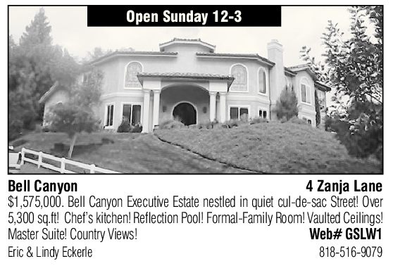 Bell Canyon 4 Zanja Lane 5,300 sq.ft! Chef’s kitchen! Reflection Pool! Formal-Family Room! Vaulted Ceilings! $1,575,000. Bell Canyon Executive Estate nestled in quiet cul-de-sac Street! Over