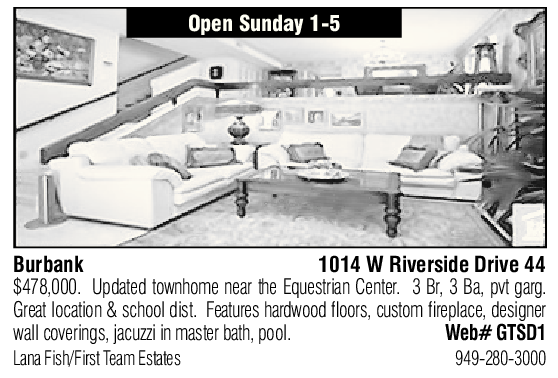 Burbank 1014 W Riverside Drive 44 Great location & school dist. Features hardwood floors, custom fireplace, designer $478,000. Updated townhome near the Equestrian Center. 3 Br, 3 Ba, pvt garg.