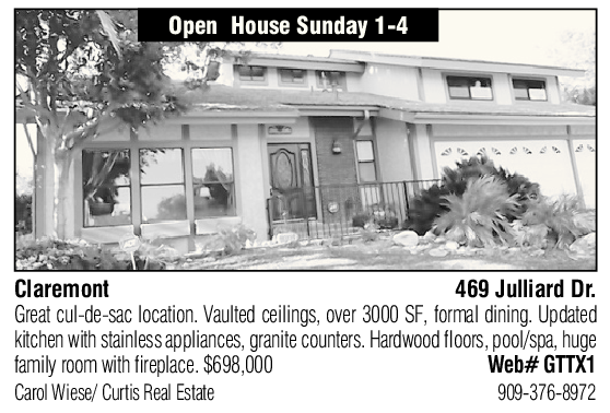 Claremont 469 Julliard Dr. Great cul-de-sac location. Vaulted ceilings, over 3000 SF, formal dining. Updated kitchen with stainless appliances, granite counters. Hardwood floors, pool/spa, huge family room with fireplace. $698,000 Web# GTTX1 Carol Wiese/ Curtis Real Estate 909-376-8972