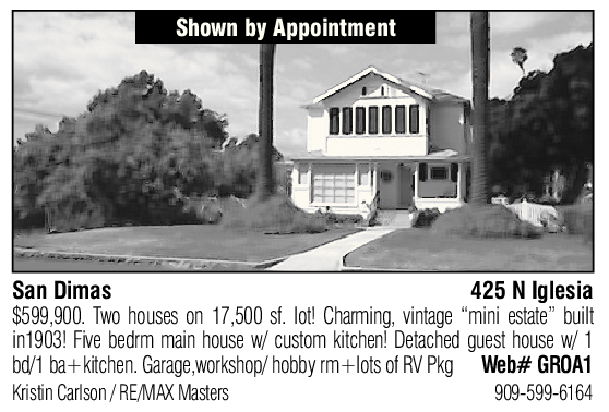 Shown by Appointment San Dimas 425 N Iglesia $599,900. Two houses on 17,500 sf. lot! Charming, vintage “mini estate” built in1903! Five bedrm main house w/ custom kitchen! Detached guest house w/ 1 bd/1 ba+kitchen. Garage,workshop/ hobby rm+lots of RV Pkg Web# GROA1 Kristin Carlson / RE/MAX Masters 909-599-6164