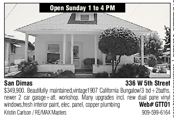 Open Sunday 1 to 4 PM San Dimas 336 W 5th Street $349,900. Beautifully maintained,vintage1907 California Bungalow!3 bd+2baths, newer 2 car garage+att. workshop. Many upgrades incl. new dual pane vinyl windows,fresh interior paint, elec. panel, copper plumbing Web# GTTO1 Kristin Carlson / RE/MAX Masters 909-599-6164