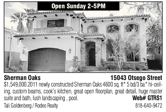 Open Sunday 2-5PM Sherman Oaks 15043 Otsego Street $1,549,000.2011 newly constructed Sherman Oaks 4600 sq. ft* 5 bd/3 ba* hi-ceiling, custom beams, cook’s kitchen, great open floorplan, great detail, huge master suite and bath, lush landscaping , pool. Web# GTRS1 Tali Goldenberg / Rodeo Realty 818-640-9472