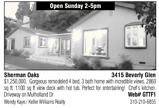 Open Sunday 2-5pm Sherman Oaks 3415 Beverly Glen sq ft. 1100 sq ft view deck with hot tub. Perfect for entertaining! Chef’s kitchen. $1,250,000. Gorgeous remodeled 4 bed, 3 bath home with incredible views. 2860 Driveway on Mulholland Dr Web# GTTF1 Wendy Kaye / Keller Williams Realty 310-210-6855 See also