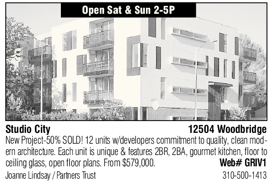 Open Sat & Sun 2-5P Studio City 12504 Woodbridge ern architecture. Each unit is unique & features 2BR, 2BA, gourmet kitchen, floor to New Project-50% SOLD! 12 units w/developers commitment to quality, clean mod- ceiling glass, open floor plans. From $579,000. Web# GRIV1 Joanne Lindsay / Partners Trust 310-500-1413