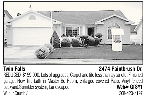 Twin Falls 2474 Paintbrush Dr. REDUCED $159,000. Lots of upgrades, Carpet and tile less than a year old, Finished garage. New Tile bath in Master Bd Room, enlarged covered Patio, Vinyl fenced backyard.Sprinkler system, Landscaped. Web# GTSY1 Wilbur Crumb / 208-420-4197