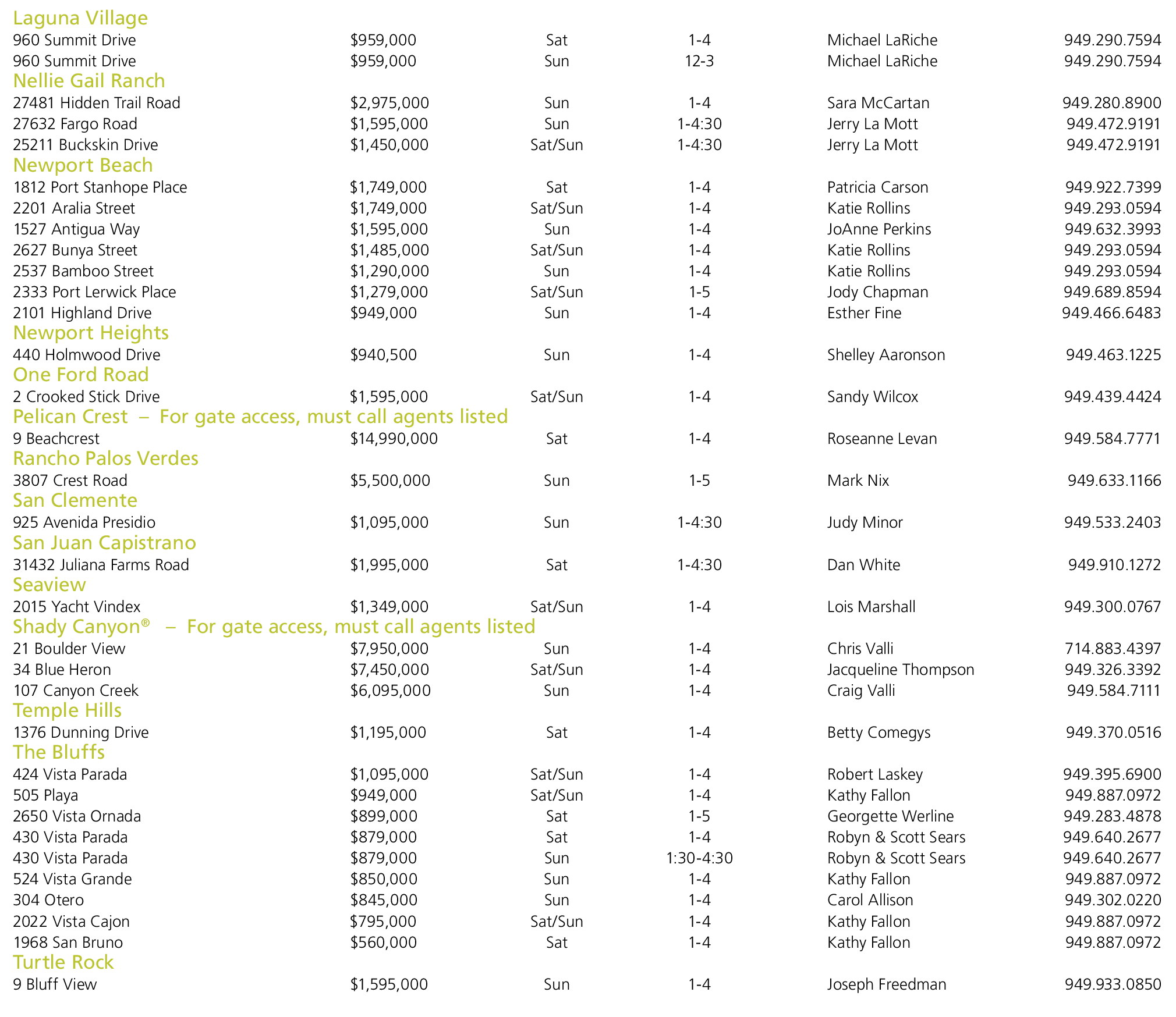 Laguna Village 960 Summit Drive $959,000 Sat 1-4 Michael LaRiche 949.290.7594 960 Summit Drive $959,000 Sun 12-3 Michael LaRiche 949.290.7594 Nellie Gail Ranch 27481 Hidden Trail Road $2,975,000 Sun 1-4 Sara McCartan 949.280.8900 27632 Fargo Road $1,595,000 Sun 1-4:30 Jerry La Mott 949.472.9191 25211 Buckskin Drive $1,450,000 Sat/Sun 1-4:30 Jerry La Mott 949.472.9191 Newport Beach 1812 Port Stanhope Place $1,749,000 Sat 1-4 Patricia Carson 949.922.7399 2201 Aralia Street $1,749,000 Sat/Sun 1-4 Katie Rollins 949.293.0594 1527 Antigua Way $1,595,000 Sun 1-4 JoAnne Perkins 949.632.3993 2627 Bunya Street $1,485,000 Sat/Sun 1-4 Katie Rollins 949.293.0594 2537 Bamboo Street $1,290,000 Sun 1-4 Katie Rollins 949.293.0594 2333 Port Lerwick Place $1,279,000 Sat/Sun 1-5 Jody Chapman 949.689.8594 2101 Highland Drive $949,000 Sun 1-4 Esther Fine 949.466.6483 Newport Heights 440 Holmwood Drive $940,500 Sun 1-4 Shelley Aaronson 949.463.1225 One Ford Road 2 Crooked Stick Drive $1,595,000 Sat/Sun 1-4 Sandy Wilcox 949.439.4424 Pelican Crest – For gate access, must call agents listed 9 Beachcrest $14,990,000 Sat 1-4 Roseanne Levan 949.584.7771 Rancho Palos Verdes 3807 Crest Road $5,500,000 Sun 1-5 Mark Nix 949.633.1166 San Clemente 925 Avenida Presidio $1,095,000 Sun 1-4:30 Judy Minor 949.533.2403 San Juan Capistrano 31432 Juliana Farms Road $1,995,000 Sat 1-4:30 Dan White 949.910.1272 Seaview 2015 Yacht Vindex $1,349,000 Sat/Sun 1-4 Lois Marshall 949.300.0767 Shady Canyon ® – For gate access, must call agents listed 21 Boulder View $7,950,000 Sun 1-4 Chris Valli 714.883.4397 34 Blue Heron $7,450,000 Sat/Sun 1-4 Jacqueline Thompson 949.326.3392 107 Canyon Creek $6,095,000 Sun 1-4 Craig Valli 949.584.7111 Temple Hills 1376 Dunning Drive $1,195,000 Sat 1-4 Betty Comegys 949.370.0516 The Bluffs 424 Vista Parada $1,095,000 Sat/Sun 1-4 Robert Laskey 949.395.6900 505 Playa $949,000 Sat/Sun 1-4 Kathy Fallon 949.887.0972 2650 Vista Ornada $899,000 Sat 1-5 Georgette Werline 949.283.4878 430 Vista Parada $879,000 Sat 1-4 Robyn & Scott Sears 949.640.2677 430 Vista Parada $879,000 Sun 1:30-4:30 Robyn & Scott Sears 949.640.2677 524 Vista Grande $850,000 Sun 1-4 Kathy Fallon 949.887.0972 304 Otero $845,000 Sun 1-4 Carol Allison 949.302.0220 2022 Vista Cajon $795,000 Sat/Sun 1-4 Kathy Fallon 949.887.0972 1968 San Bruno $560,000 Sat 1-4 Kathy Fallon 949.887.0972 Turtle Rock 9 Bluff View $1,595,000 Sun 1-4 Joseph Freedman 949.933.0850