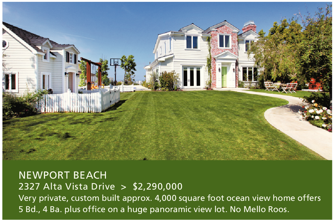 NEWPORT BEACH 2327 Alta Vista Drive > $2,290,000 Very private, custom built approx. 4,000 square foot ocean view home offers 5 Bd., 4 Ba. plus office on a huge panoramic view lot. No Mello Roos.