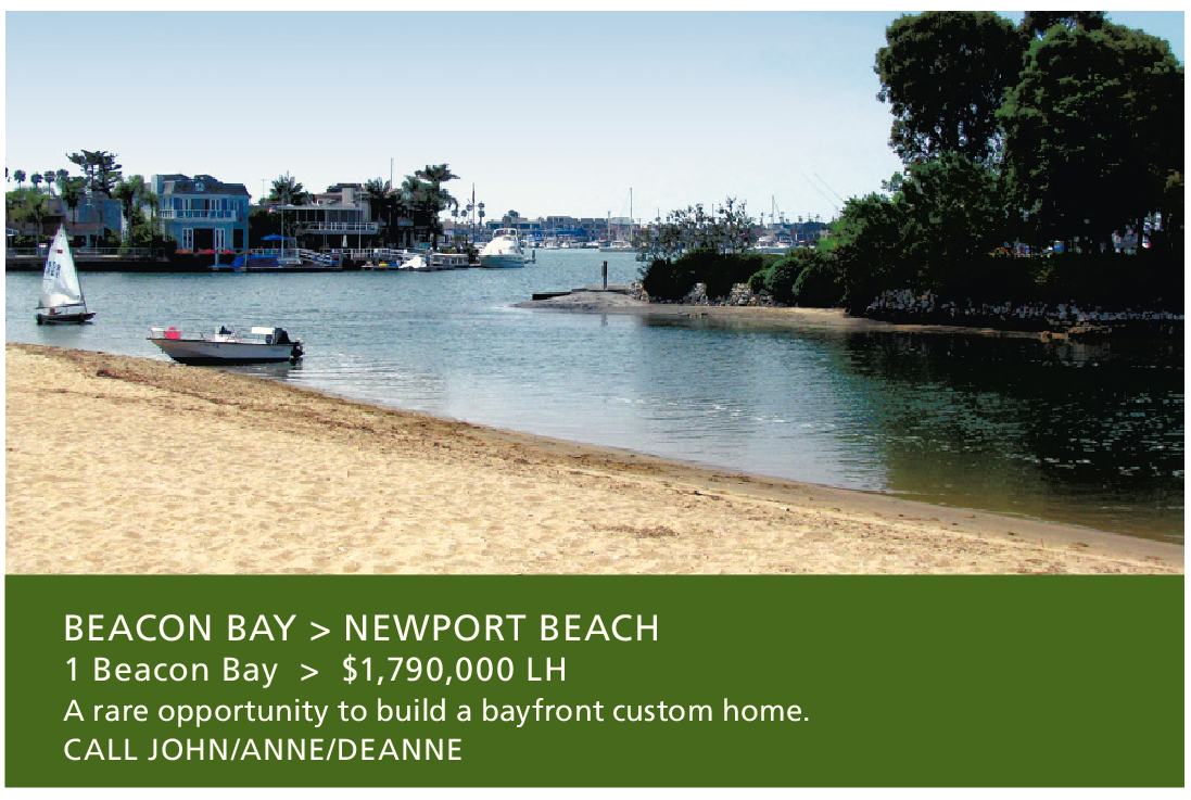BEACON BAY > NEWPORT BEACH 1 Beacon Bay > $1,790,000 LH A rare opportunity to build a bayfront custom home. CALL JOHN/ANNE/DEANNE