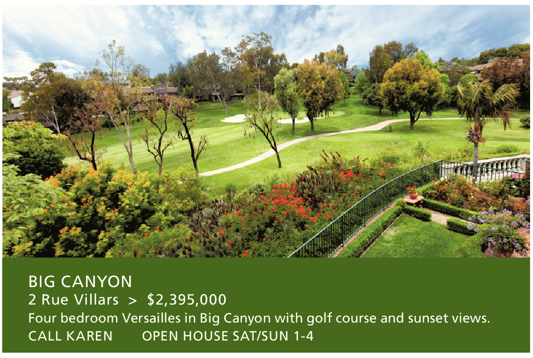 BIG CANYON 2 Rue Villars > $2,395,000 Four bedroom Versailles in Big Canyon with golf course and sunset views. CALL KAREN OPEN HOUSE SAT/SUN 1-4