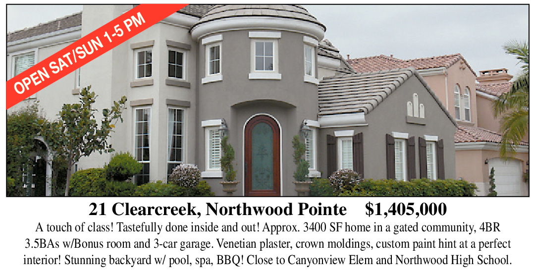 21 Clearcreek, Northwood Pointe $1,405,000 A touch of class! Tastefully done inside and out! Approx. 3400 SF home in a gated community, 4BR 3.5BAs w/Bonus room and 3-car garage. Venetian plaster, crown moldings, custom paint hint at a perfect interior! Stunning backyard w/ pool, spa, BBQ! Close to Canyonview Elem and Northwood High School.