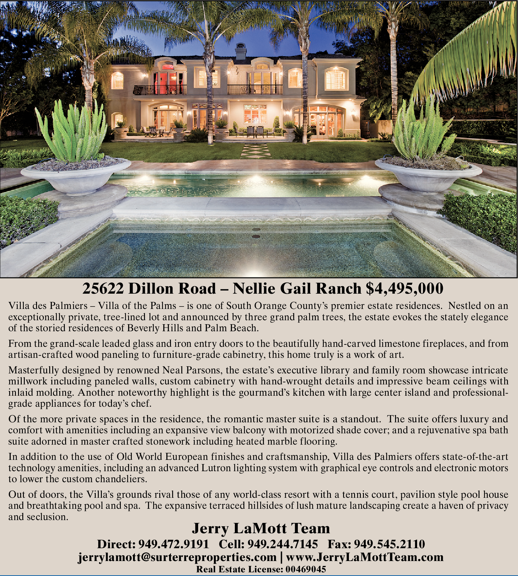 25622 Dillon Road – Nellie Gail Ranch $4,495,000 Villa des Palmiers – Villa of the Palms – is one of South Orange County’s premier estate residences. Nestled on an exceptionally private, tree-lined lot and announced by three grand palm trees, the estate evokes the stately elegance of the storied residences of Beverly Hills and Palm Beach. From the grand-scale leaded glass and iron entry doors to the beautifully hand-carved limestone fireplaces, and from artisan-crafted wood paneling to furniture-grade cabinetry, this home truly is a work of art. Masterfully designed by renowned Neal Parsons, the estate’s executive library and family room showcase intricate millwork including paneled walls, custom cabinetry with hand-wrought details and impressive beam ceilings with inlaid molding. Another noteworthy highlight is the gourmand’s kitchen with large center island and professionalgrade appliances for today’s chef. Of the more private spaces in the residence, the romantic master suite is a standout. The suite offers luxury and comfort with amenities including an expansive view balcony with motorized shade cover; and a rejuvenative spa bath suite adorned in master crafted stonework including heated marble flooring. In addition to the use of Old World European finishes and craftsmanship, Villa des Palmiers offers state-of-the-art technology amenities, including an advanced Lutron lighting system with graphical eye controls and electronic motors to lower the custom chandeliers. Out of doors, the Villa’s grounds rival those of any world-class resort with a tennis court, pavilion style pool house and breathtaking pool and spa. The expansive terraced hillsides of lush mature landscaping create a haven of privacy and seclusion. Jerry LaMott Team Direct: 949.472.9191 Cell: 949.244.7145 Fax: 949.545.2110 jerrylamott@surterreproperties.com | www.JerryLaMottTeam.com Real Estate License: 00469045