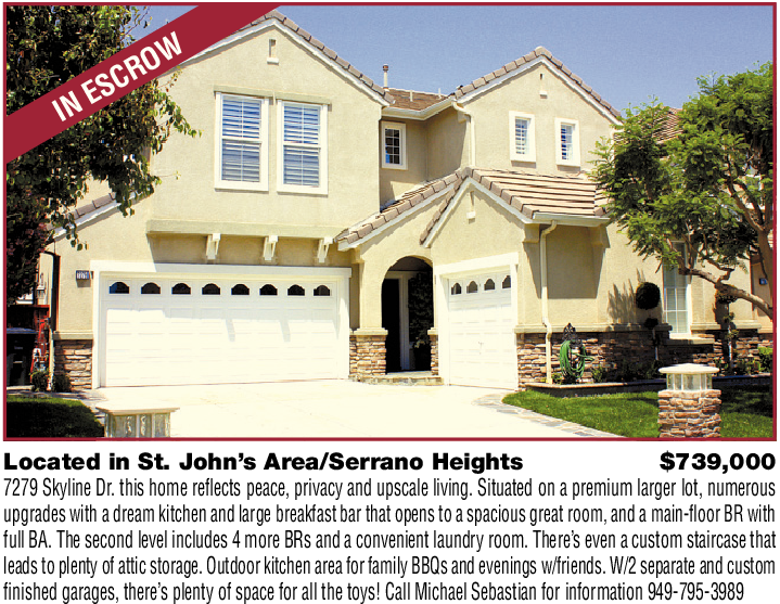 Located in St. John’s Area/Serrano Heights $739,000 7279 Skyline Dr. this home reflects peace, privacy and upscale living. Situated on a premium larger lot, numerous upgrades with a dream kitchen and large breakfast bar that opens to a spacious great room, and a main-floor BR with full BA. The second level includes 4 more BRs and a convenient laundry room. There’s even a custom staircase that leads to plenty of attic storage. Outdoor kitchen area for family BBQs and evenings w/friends. W/2 separate and custom finished garages, there’s plenty of space for all the toys! Call Michael Sebastian for information 949-795-3989