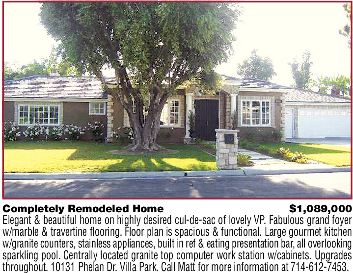 Completely Remodeled Home $1,089,000 Elegant & beautiful home on highly desired cul-de-sac of lovely VP. Fabulous grand foyer w/marble & travertine flooring. Floor plan is spacious & functional. Large gourmet kitchen w/granite counters, stainless appliances, built in ref & eating presentation bar, all overlooking sparkling pool. Centrally located granite top computer work station w/cabinets. Upgrades throughout. 10131 Phelan Dr. Villa Park. Call Matt for more information at 714-612-7453.