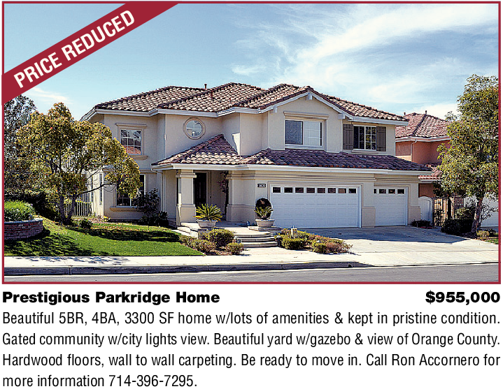 Prestigious Parkridge Home $955,000 Beautiful 5BR, 4BA, 3300 SF home w/lots of amenities & kept in pristine condition. Gated community w/city lights view. Beautiful yard w/gazebo & view of Orange County. Hardwood floors, wall to wall carpeting. Be ready to move in. Call Ron Accornero for more information 714-396-7295.