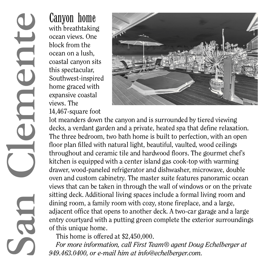 with breathtaking ocean views. One block from the ocean on a lush, coastal canyon sits this spectacular, Southwest-inspired home graced with expansive coastal views. The 14,467-square foot lot meanders down the canyon and is surrounded by tiered viewing decks, a verdant garden and a private, heated spa that define relaxation. The three bedroom, two bath home is built to perfection, with an open floor plan filled with natural light, beautiful, vaulted, wood ceilings throughout and ceramic tile and hardwood floors. The gourmet chef’s kitchen is equipped with a center island gas cook-top with warming drawer, wood-paneled refrigerator and dishwasher, microwave, double oven and custom cabinetry. The master suite features panoramic ocean views that can be taken in through the wall of windows or on the private sitting deck. Additional living spaces include a formal living room and dining room, a family room with cozy, stone fireplace, and a large, adjacent office that opens to another deck. A two-car garage and a large entry courtyard with a putting green complete the exterior surroundings of this unique home. This home is offered at $2,450,000. For more information, call First Team® agent Doug Echelberger at 949.463.0400, or e-mail him at info@echelberger.com. Canyon home