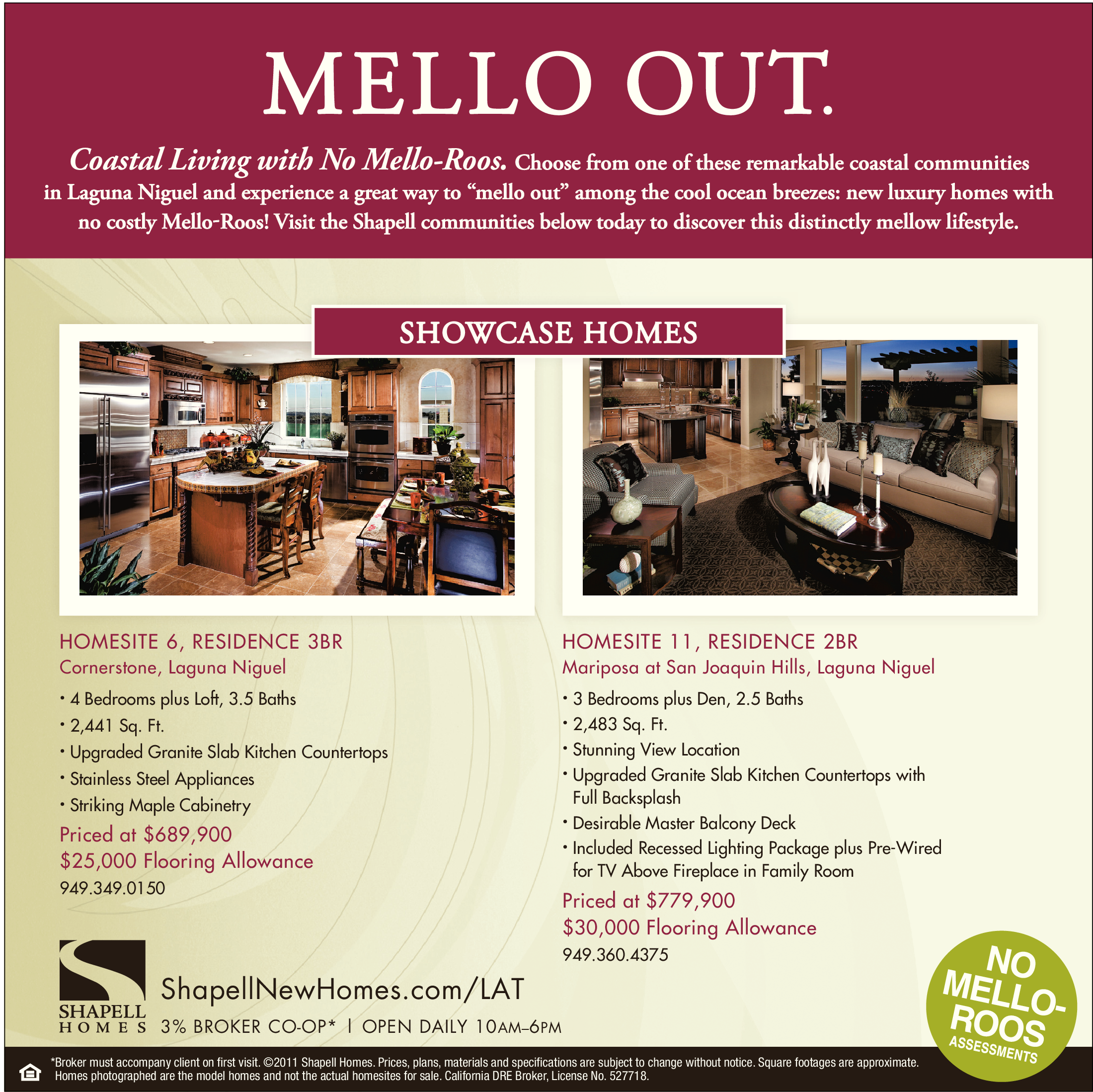 in Laguna Niguel and experience a great way to “mello out” among the cool ocean breezes: new luxury homes with no costly Mello-Roos! Visit the Shapell communities below today to discover this distinctly mellow lifestyle.