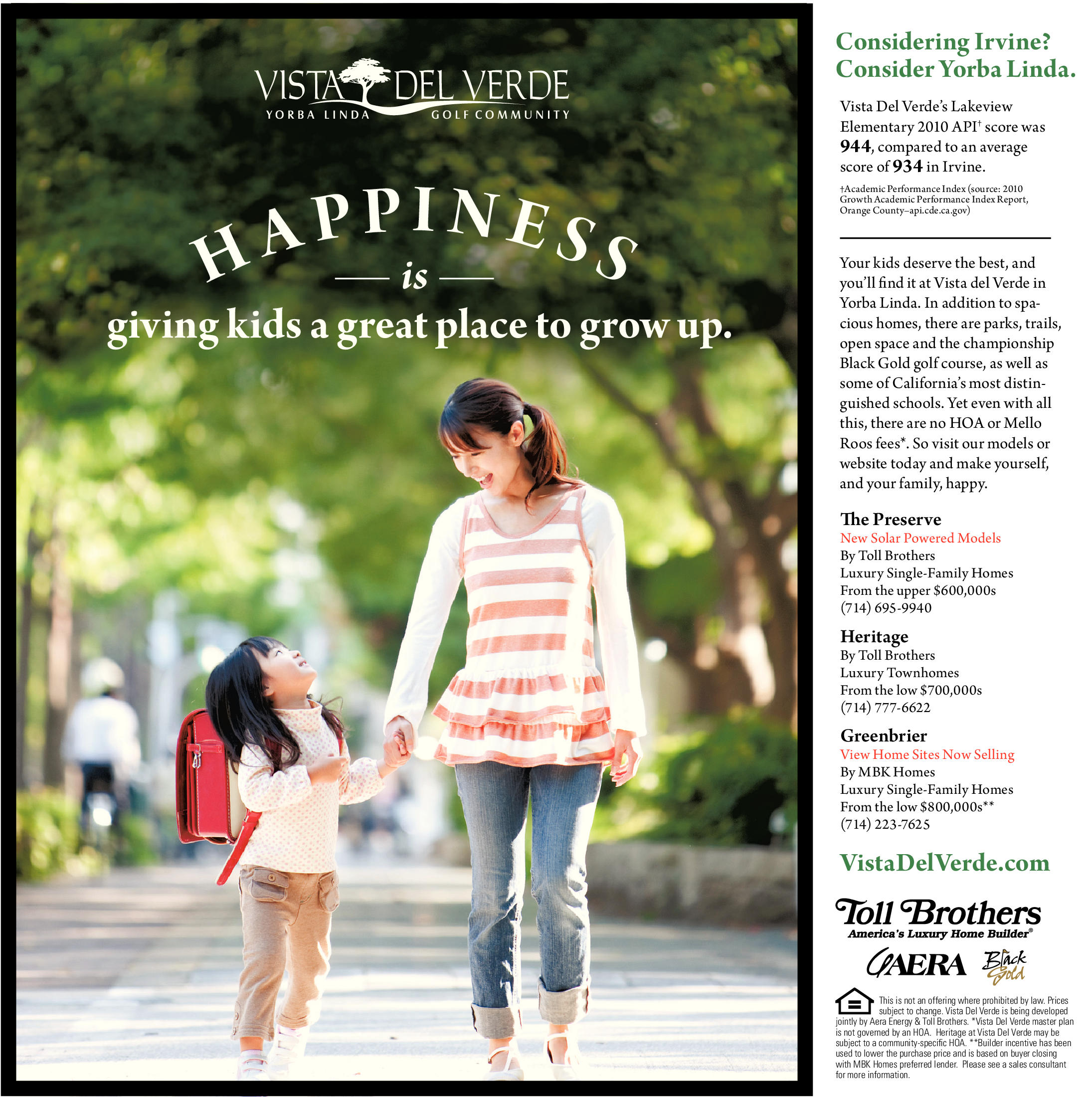 is giving kids a great place to grow up. Considering Irvine? Consider Yorba Linda. Vista Del Verde’s Lakeview Elementary 2010 API † score was 944, compared to an average score of 934 in Irvine. †AcademicPerformanceIndex(source:2010 Growth Academic Performance Index Report, Orange County–api.cde.ca.gov) Your kids deserve the best, and you’ll find it at Vista del Verde in Yorba Linda. In addition to spacious homes, there are parks, trails, open space and the championship Black Gold golf course, as well as some of California’s most distinguished schools. Yet even with all this, there are no HOA or Mello Roos fees*. So visit our models or website today and make yourself, and your family, happy. The Preserve New Solar Powered Models By Toll Brothers Luxury Single-Family Homes From the upper $600,000s (714) 695-9940 Heritage By Toll Brothers Luxury Townhomes From the low $700,000s (714) 777-6622 Greenbrier View Home Sites Now Selling By MBK Homes Luxury Single-Family Homes From the low $800,000s** (714) 223-7625 VistaDelVerde.com This is not an offering where prohibited by law. Prices subject to change. Vista Del Verde is being developed jointly by Aera Energy & Toll Brothers. *Vista Del Verde master plan is not governed by an HOA. Heritage at Vista Del Verde may be subject to a community-specific HOA. **Builder incentive has been used to lower the purchase price and is based on buyer closing with MBK Homes preferred lender. Please see a sales consultant for more information.